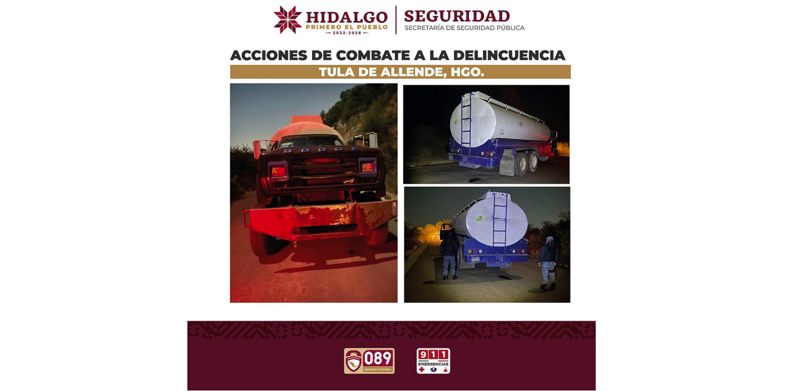 Los hechos tuvieron lugar en el tramo Monte Alegre – Santiago Tlahua del municipio mencionado, en donde por medio de patrullajes de seguridad y vigilancia en la zona fue que localizaron un camión tipo cisterna abandonado en el lugar, posteriormente, el camión fue resguardado y trasladado ante las autoridades correspondientes.