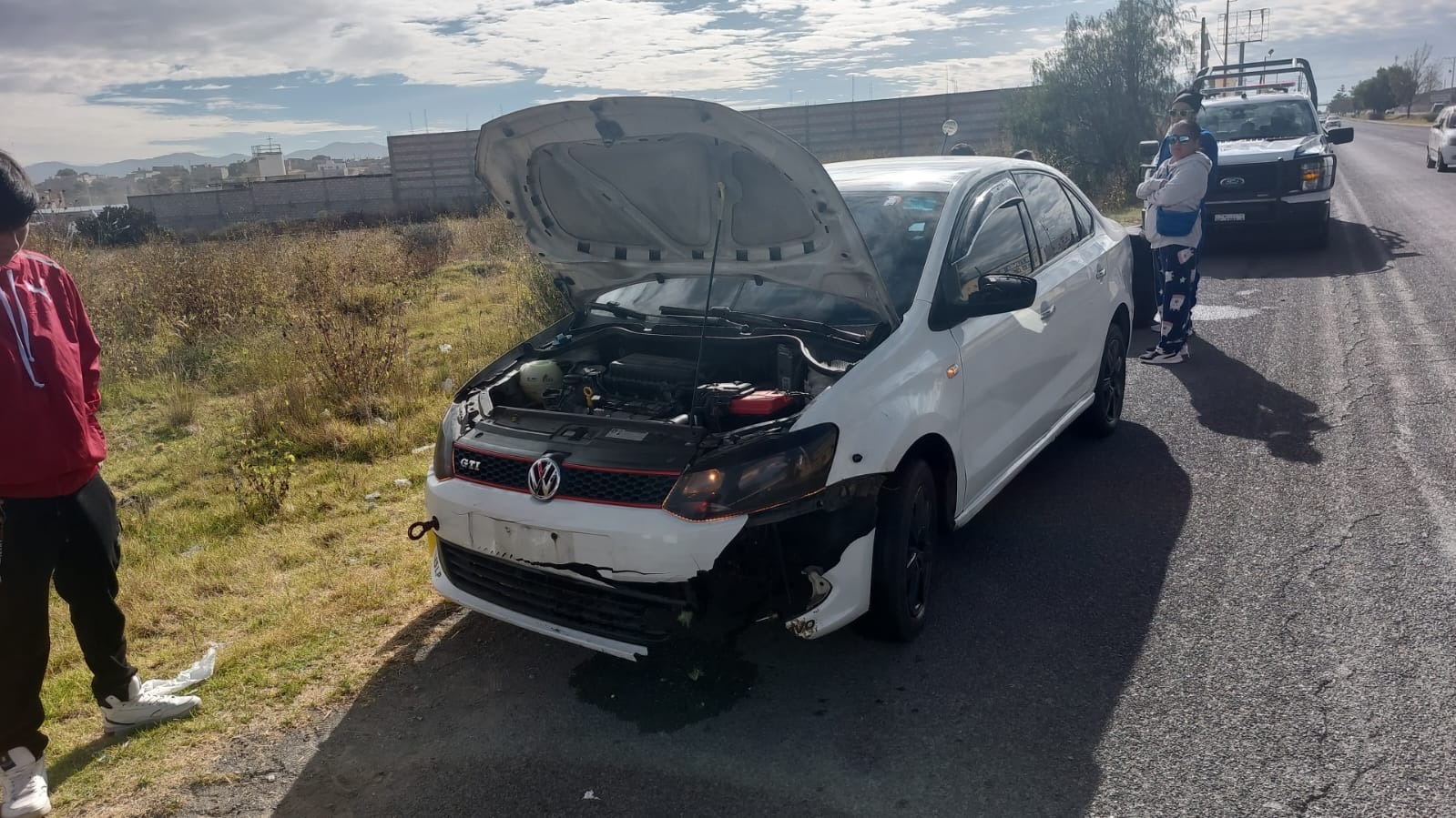 Elementos policiales que circulaban sobre la carretera Pachuca-Actopan se percataron que una unidad marca Volkswagen Vento blanco, placas 919ZYF del Estado de México, se encontraba con parte de la facia delantera quebrada y el radiador dañado.