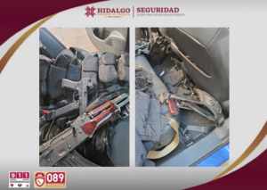 En una segunda acción, en la colonia 18 de Marzo, municipio de Atitalaquia, fue asegurada una camioneta Journey azul con cuatro personas, en su mayoría originarias de Jalisco. En el lugar se decomisaron tres armas largas, 45 cargadores abastecidos, un arma corta, tres porta cargadores y 455 dosis de diversas drogas.
