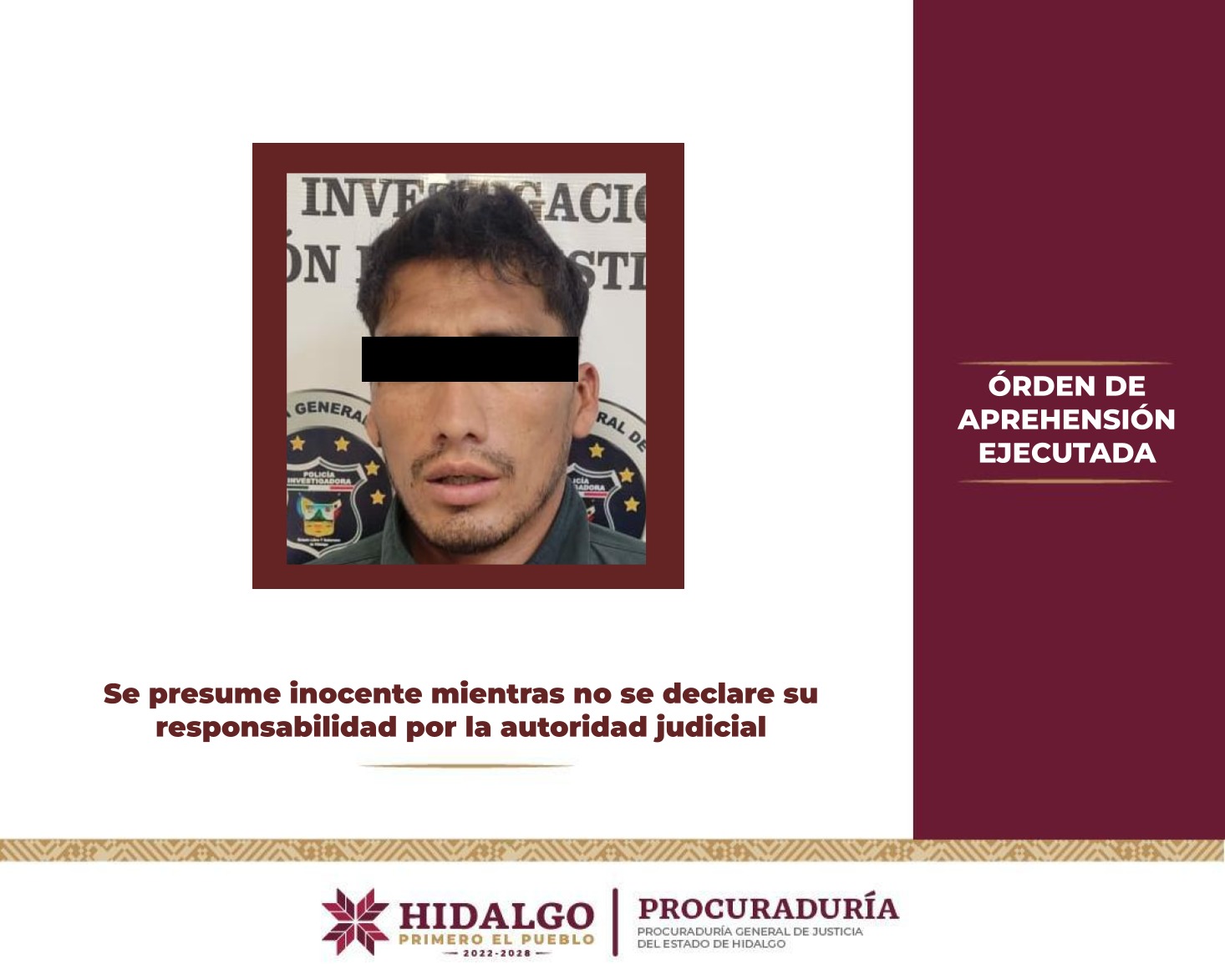 El mandamiento judicial se ejecutó en Texcoco, Estado de México. El Ministerio Público adscrito a la PGJEH solicitó a la autoridad competente fijar fecha y hora para que se lleve a cabo la audiencia inicial en la que se le formulará imputación, misma que se estableció para este 10 de junio, en los juzgados penales de Pachuca de Soto.