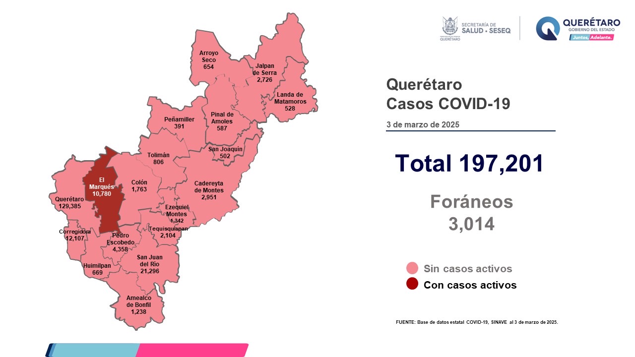 La Secretaría de Salud de Querétaro reportó este lunes cero defunciones por COVID-19, y que en los últimos siete días se han sumado cinco casos de la enfermedad en el estado,se trata de tres mujeres y dos hombres. El registro acumulado es de 197 mil 201 casos; 54 por ciento son mujeres y 46 por ciento son hombres.
