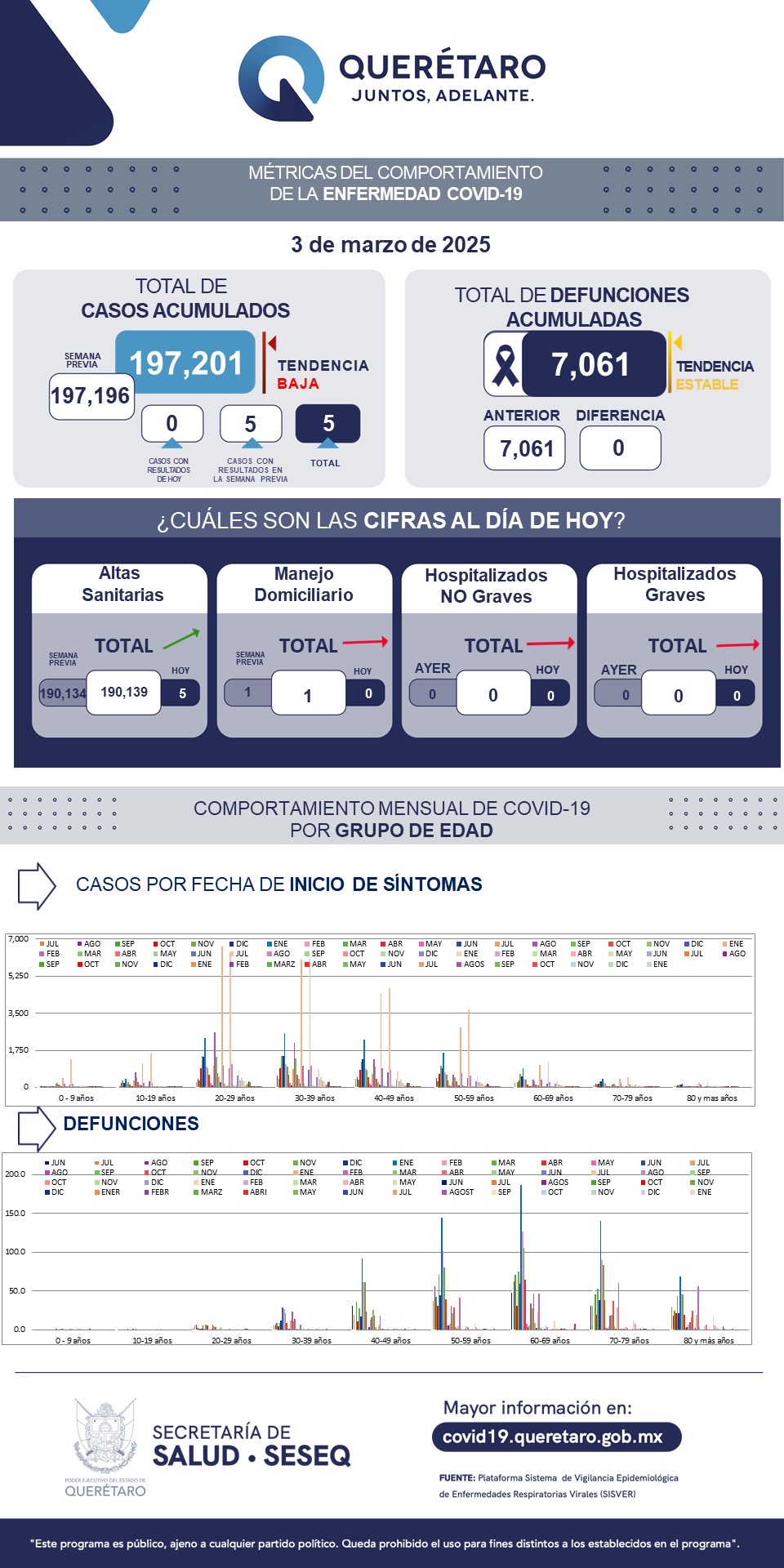 Se dio de alta sanitaria a cinco pacientes, con lo que se tiene un registro de 190 mil 139 altas (96.42 por ciento). Con sintomatología leve, aislamiento y manejo en su domicilio hay un paciente y ninguno se encuentra hospitalizado. Se han registrado siete mil 61 defunciones.