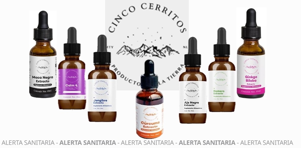 - No adquirir, suministrar, ni utilizar los productos Maca Negra extracto, Calm, Jengibre extracto, Cúrcuma extracto, Ajo Negro extracto, Romero extracto, Romero extracto, Ginkgo Biloba extracto de la marca CINCO CERRITOS en las presentaciones de gotero de 30 mL, ya que no se garantiza la seguridad, calidad y eficacia.