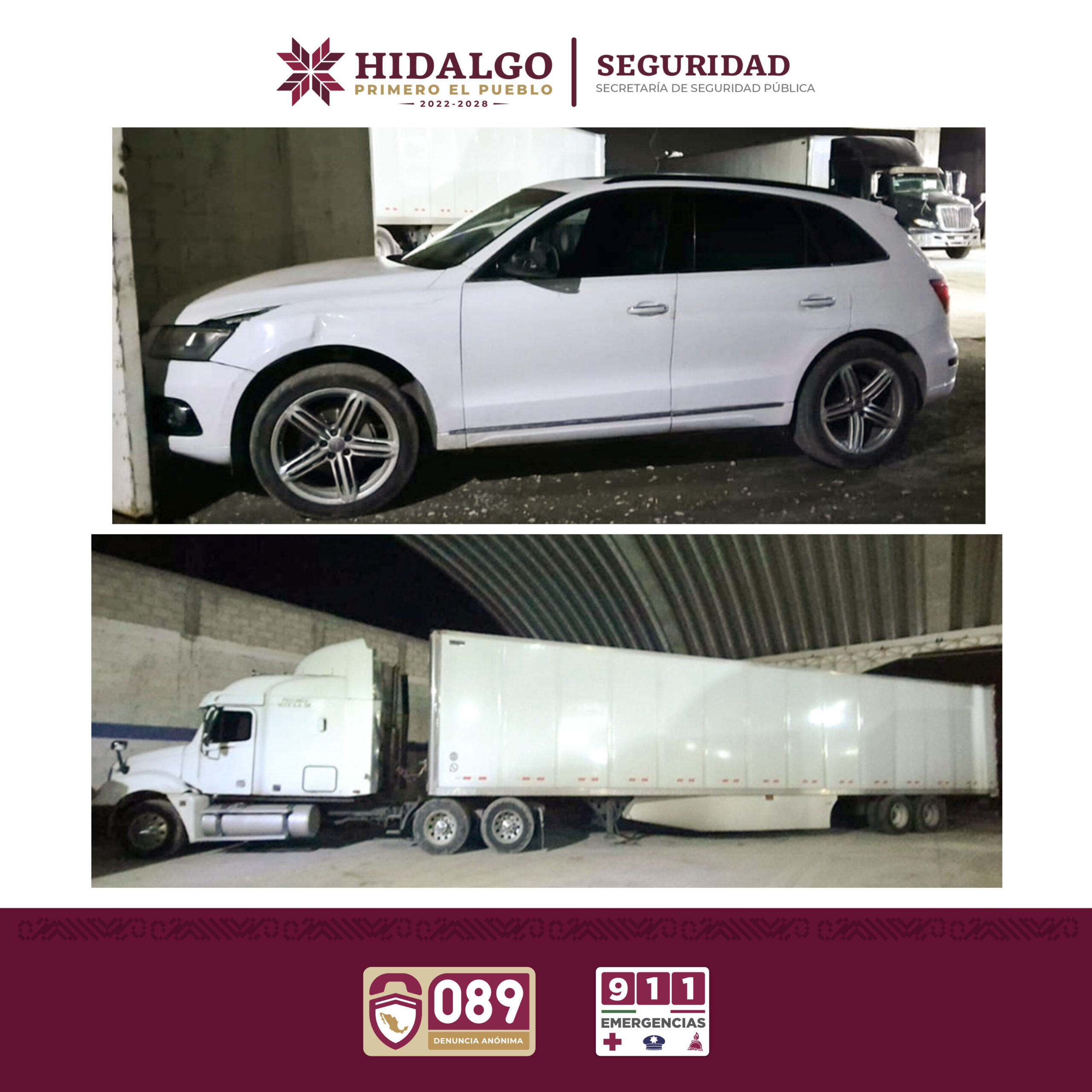 Por tal motivo, en coordinación con la Procuraduría General de Justicia del Estado de Hidalgo (PGJEH), se cumplimentó una orden de cateo en un domicilio ubicado en la colonia San Miguel Nopalapa, donde fue hallada una camioneta marca Audi y un tractocamión acoplado a una caja seca.