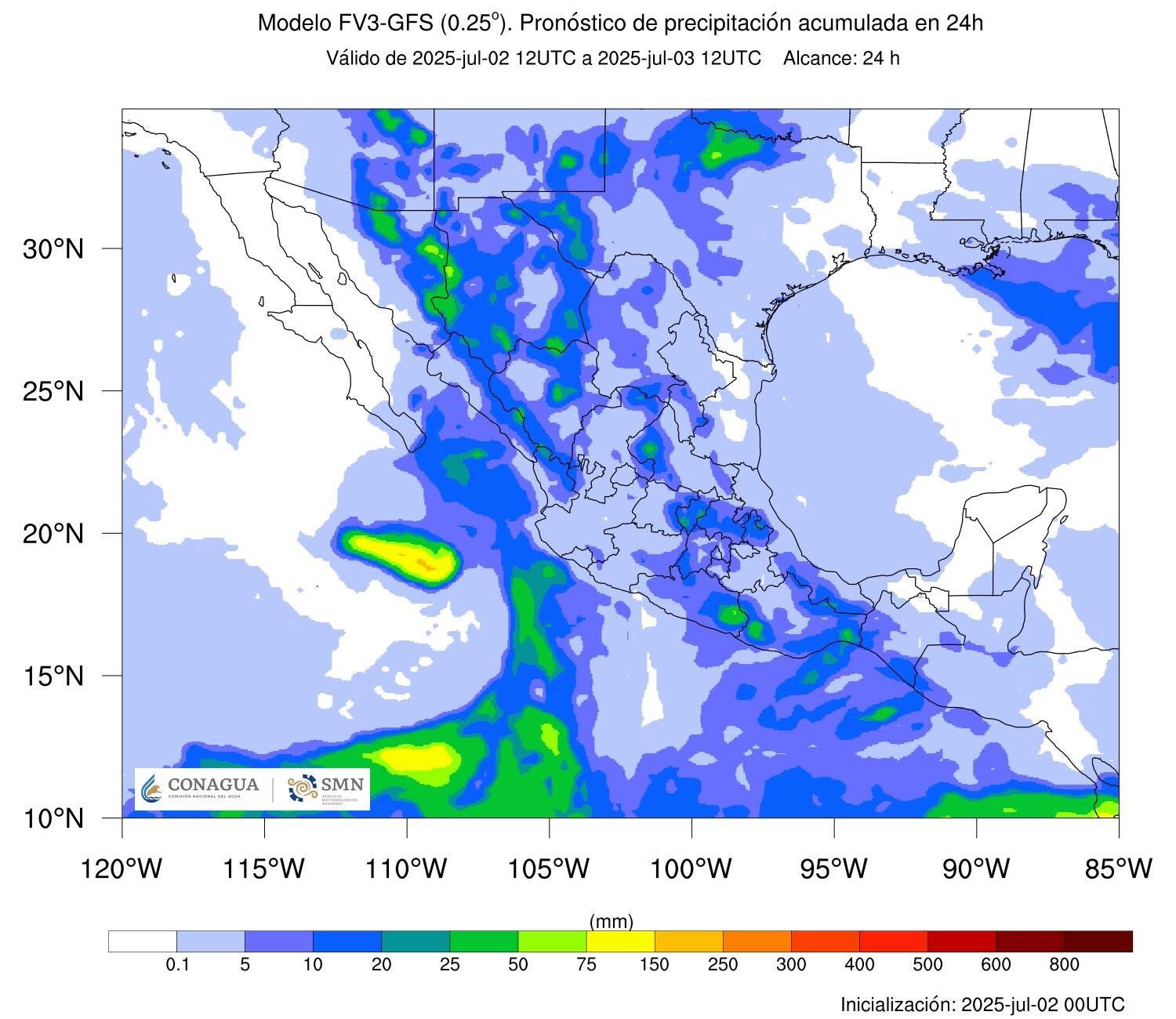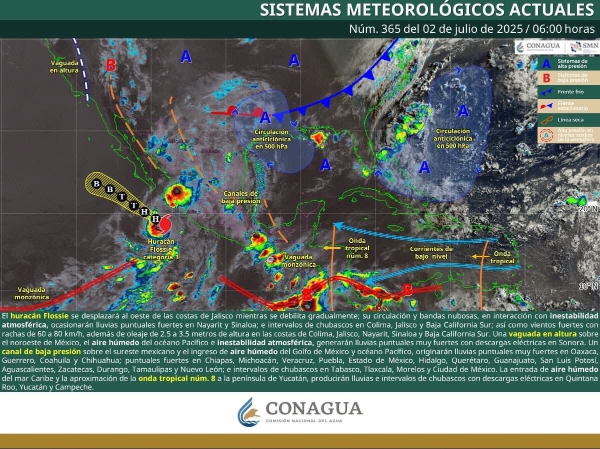De acuerdo con la Comisión Nacional del Agua (Conagua), el huracán Flossie sigue ocasionando lluvias, mientras se desplaza al oeste de las costas de Jalisco debilitándose gradualmente, generando bandas nubosas y lluvias puntuales en la entidad.