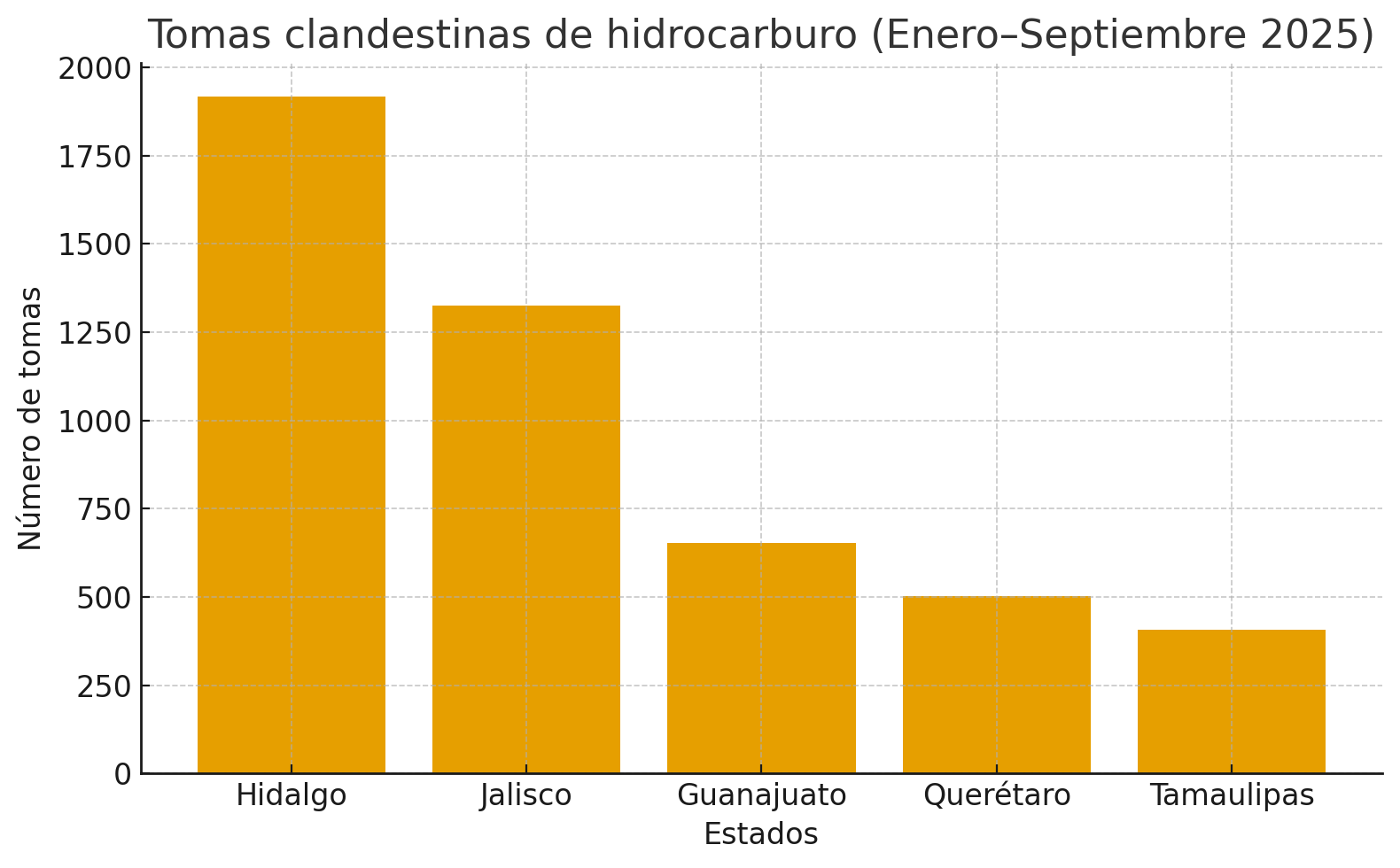 En el primer semestre de 2025, Pemex contabilizó 4,882 tomas clandestinas a nivel nacional. Hidalgo concentró 1 de cada 4 perforaciones del país, es decir, el 25.5% del total.