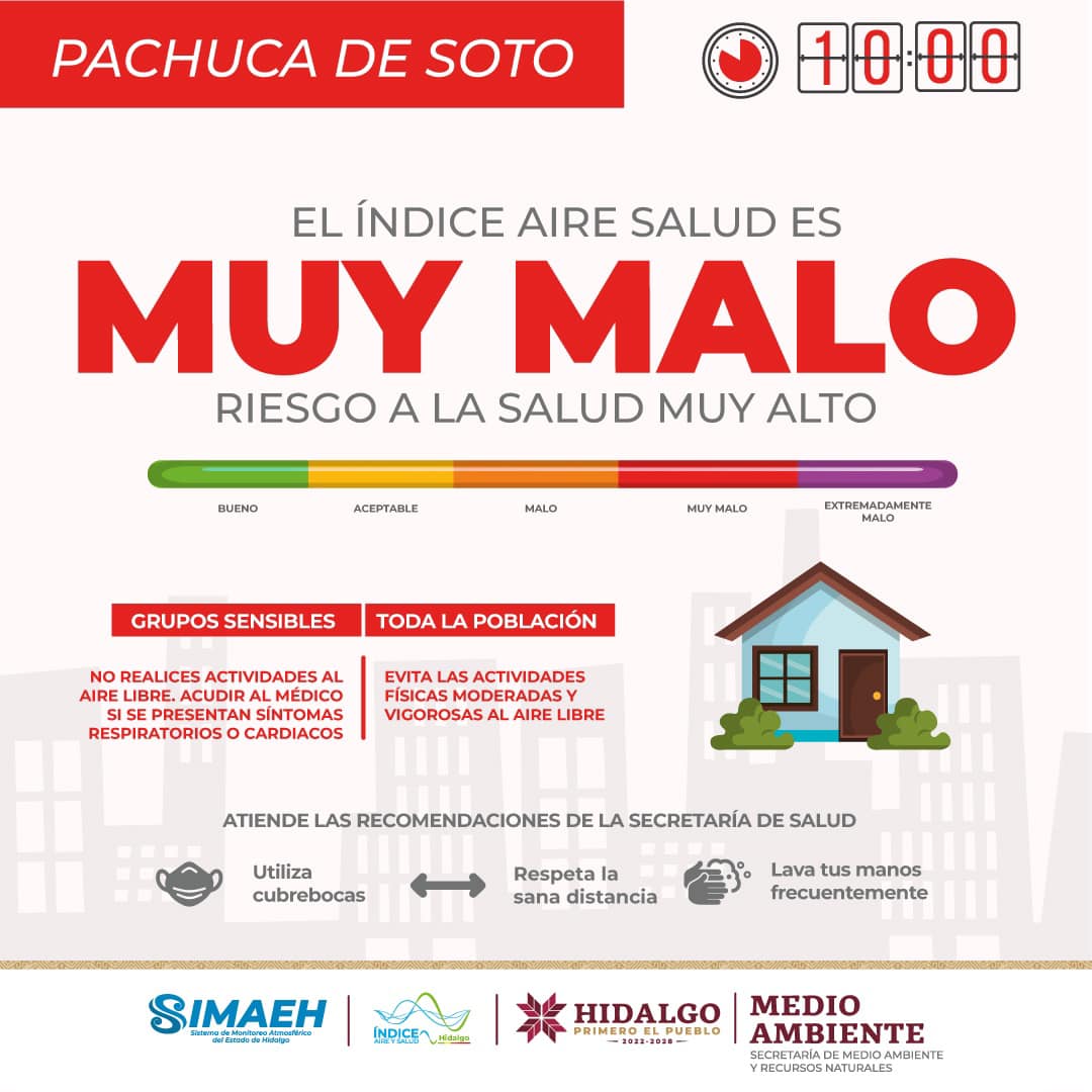 A través de su pagina oficial de Facebook, la Secretaría del Medio Ambiente y Recursos Naturales de Hidalgo (Semarnath) informó que el día de hoy la bella airosa se encuentra con un riesgo a la salud debido a la muy mala calidad del aire.