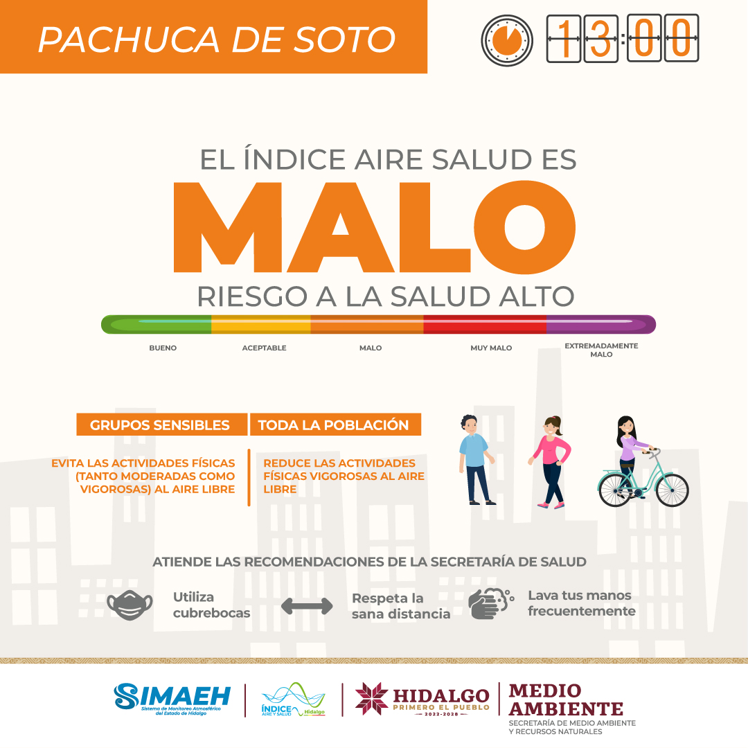 Por medio de su página de Facebook, la secretaría de Medio Ambiente y Recursos Naturales de Hidalgo (Semarnath) dio a conocer que el índice de aire se encuentra en malo para la bella airosa, lo que podría afectar a grupos sensibles.