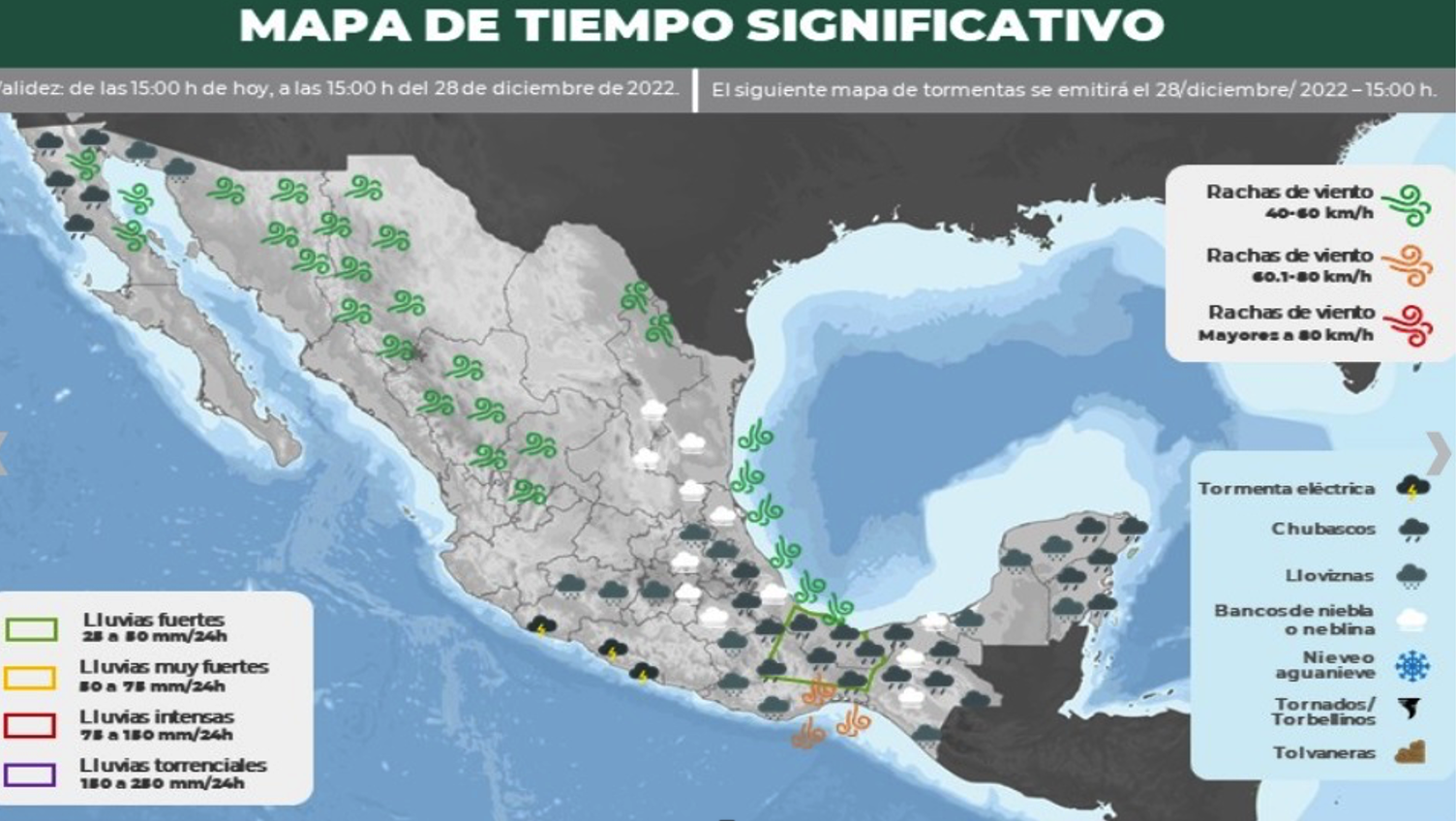 En el Istmo Y Golfo de Tehuantepec habrá rachas de viento de 60 a 80 kilómetros por hora, y de 40 a 50 kilómetros por hora en las costas de Tamaulipas y Veracruz.