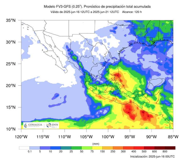 Para los estados de Veracruz, Oaxaca y Chiapas se esperan lluvias puntuales intensas con descargas eléctricas; lluvias puntuales fuertes: Tabasco, Tlaxcala, Morelos, Ciudad de México, Hidalgo, Querétaro, Aguascalientes, San Luis Potosí, Nuevo león y Coahuila, con posible caída de granizo.