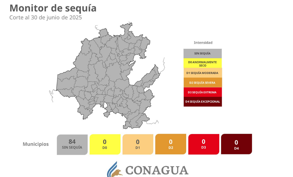 Datos del Monitor de Sequía en México del Servicio Meteorológico Nacional (SMN) con corte al 30 de junio de 2025, la Comisión Nacional del Agua (Conagua), a través de su Dirección Local Hidalgo, informa que los 84 municipios que conforman el territorio hidalguense se encuentran libres de sequía.