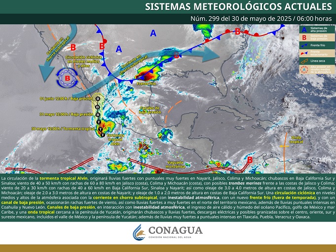 Alvin sigue desplazándose del océano Pacífico al suroeste de las costas de Colima y Jalisco, su circulación propiciará desprendimientos nubosos hacia el occidente del país y Baja California Sur, originando lluvias fuertes con puntuales muy fuertes en Nayarit, Jalisco, Colima y Michoacán; chubascos en Baja California Sur y Sinaloa.
