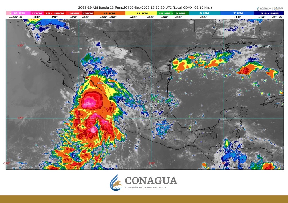 Los desprendimientos nubosos del sistema originarán lluvias intensas de 75 a 150 milímetros en Baja California Sur, Sinaloa y Nayarit, y muy fuertes de 50 a 75 mm en Jalisco, Colima y Michoacán.