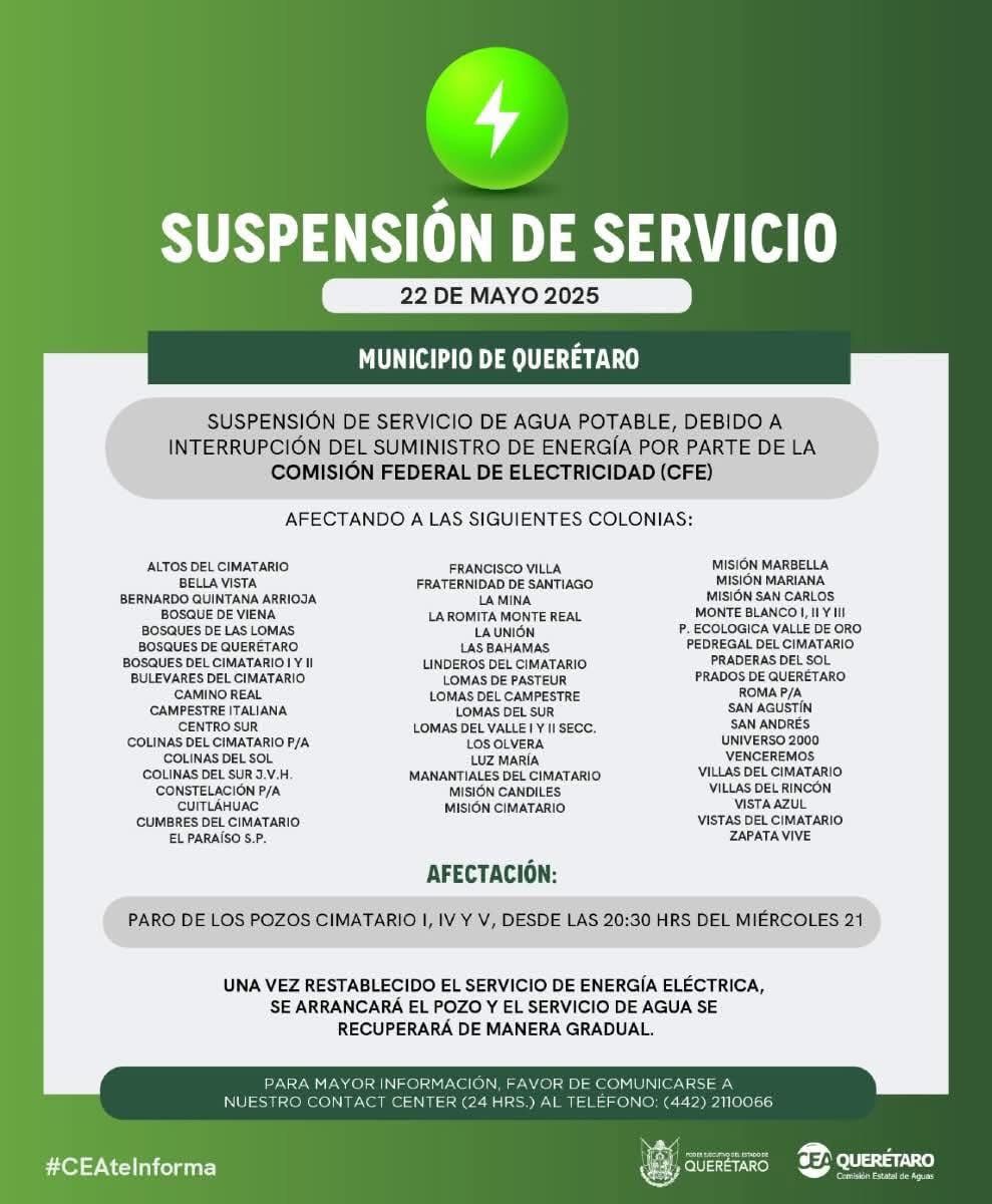 La CEA informó que la falla eléctrica provocó la suspensión de operaciones en los pozos Cimatario I, IV y V a partir de las 20:30 horas del día miércoles 21 de mayo, afectando el abasto en diversas zonas de la ciudad