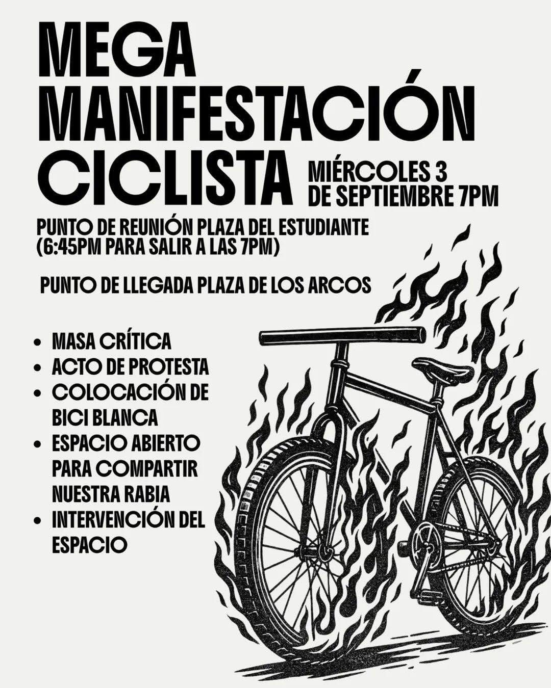 La movilización se llevará a cabo este miércoles 3 de septiembre. El punto de reunión será la Plaza del Estudiante a las 6:45 p.m., desde donde partirán a las 7:00 p.m. rumbo a Calzada de los Arcos.